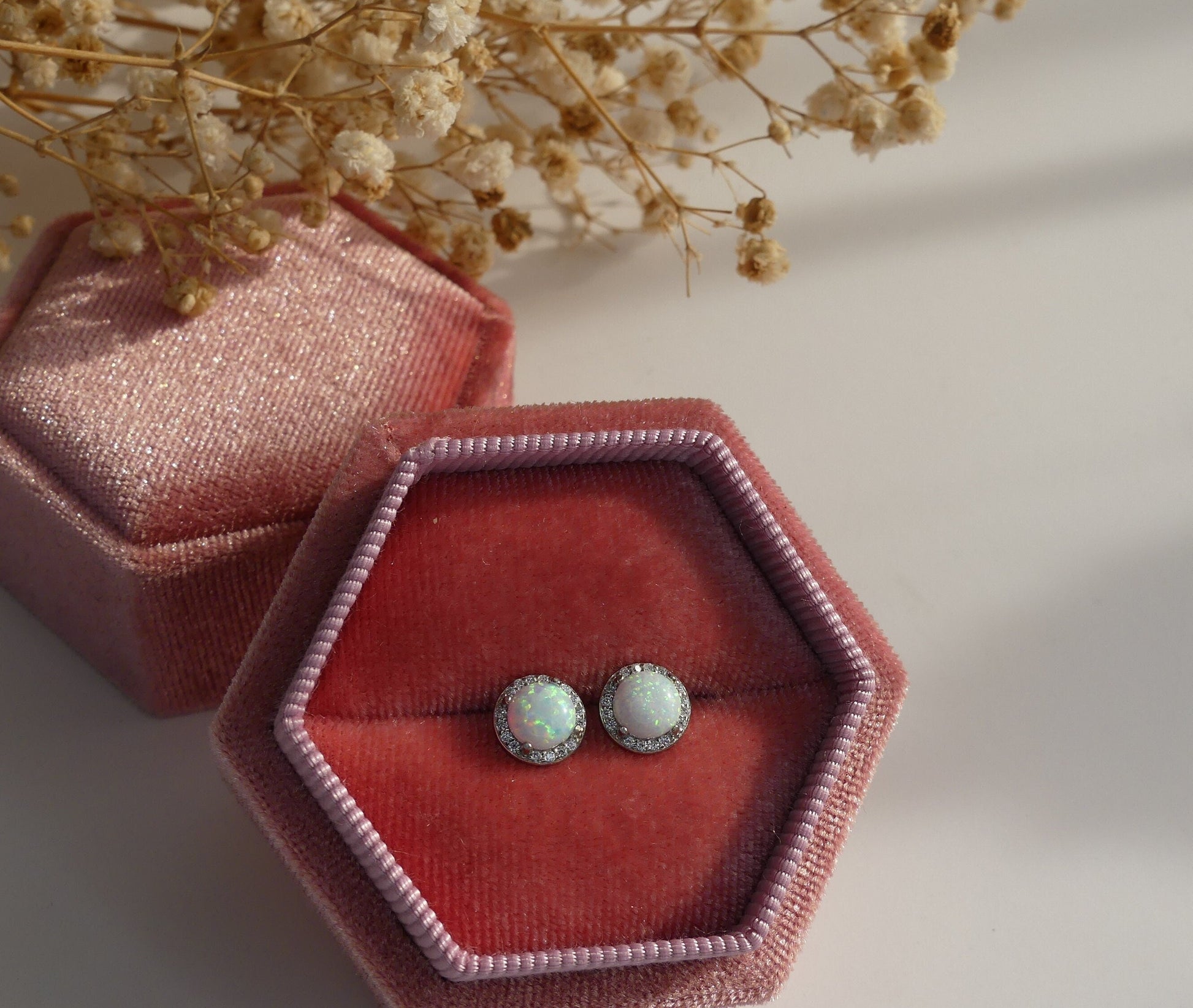0.75 ct opal round stud earrings, Round white Opal, Stud halo Earrings, minimalist stud earring, October birthstone, opal earrings