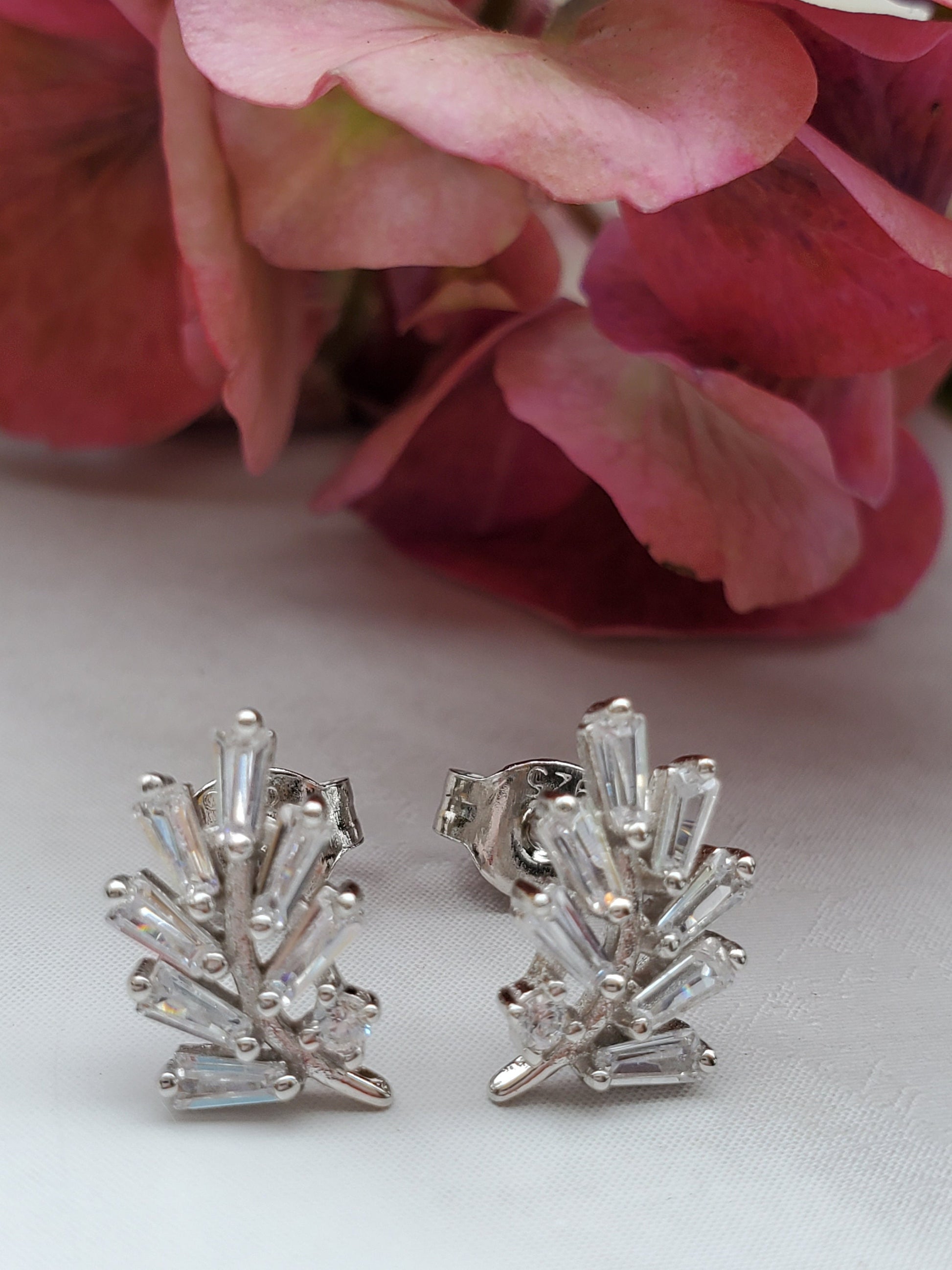 Baguette earrings, leaf earrings, stud earring, bridesmaid jewelry, engagement gift, silver earring, gift for her